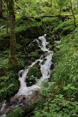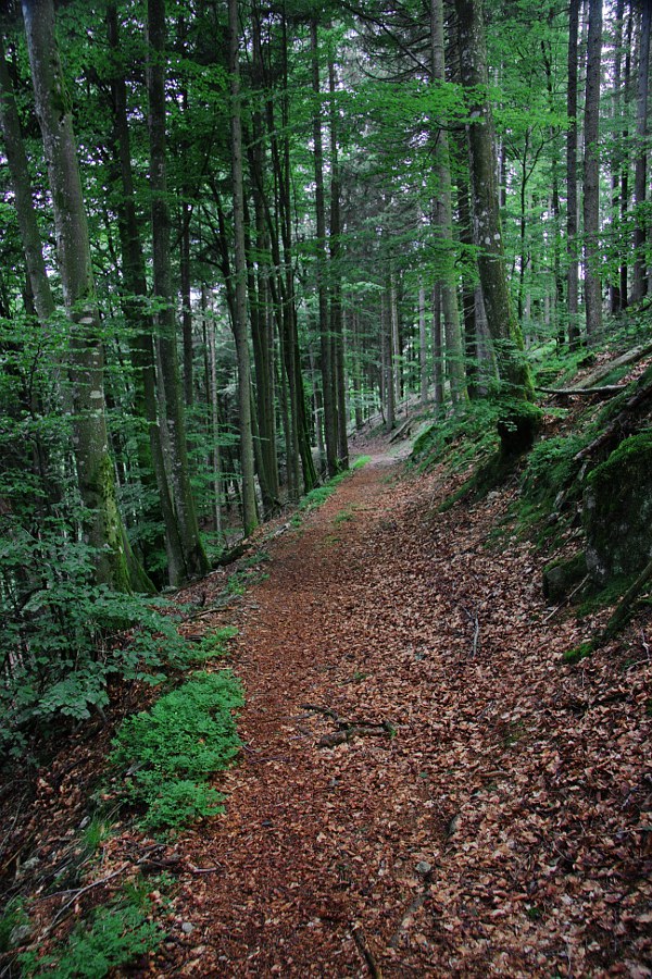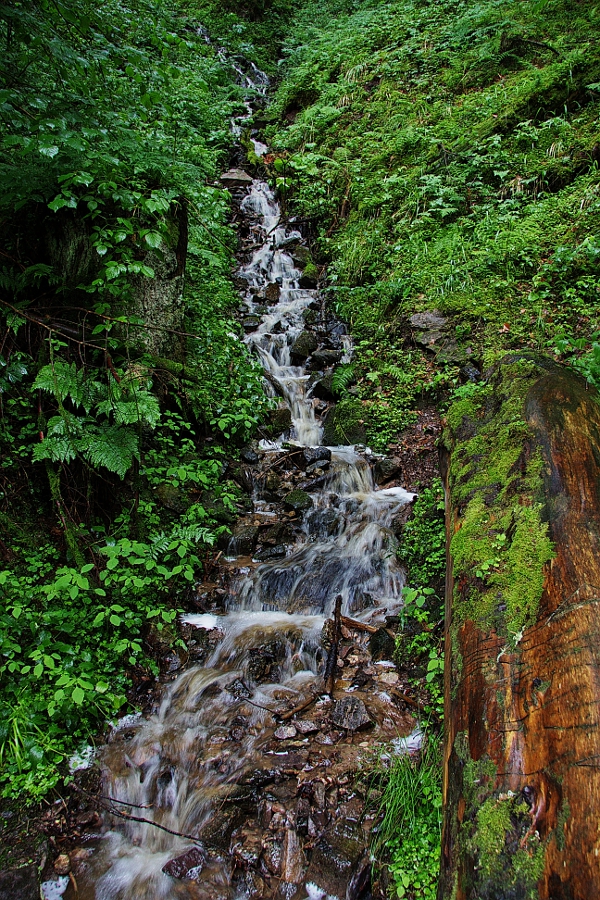 Nun folgt auf der rechten Seite der Werra ein erneuter steiler Aufstieg entlang eines über Kaskaden hinabstürzenden Bergbaches, auf jeder Höhe bilden sich neue faszinierende Wasserformationen. Bemooste Baumstämme überragen den Bach, Farne und andere krautige Gewächse gedeihen hier im feuchten, kühlen Grund. Auf der Höhe angekommen fängt es für wenige Minuten leicht an zu nieseln, dies soll aber der einzige nennenswerte Niederschlag am heutigen Tag sein. Der Weg folgt jetzt vermehrt den Nebentälern und fällt dann zur Werra wiederholte Male wieder ab. Dabei eröffnet er uns selten schöne Aussichten in das langsam weiter werdende Tal, interessante Gesteinsformationen fallen aber immer wieder ins Auge. Der Weg wird nun deutlich breiter und schließlich wandern wir auf einem geschotterten Weg in Richtung Todtmoos-Au. Der Weg bleibt bis zum Ende zu unserem Leidwesen breit und geschottert. In Todtmoos-Au besuchen wir die kleine, gemütliche St. Josef-Kapelle. Es ist immer wieder erstaunlich, wie prunkvoll hier in der Gegend selbst kleinste Kapellen sind. An einem kleinen Tiergehege mit Rehen und Wildschweinen geht es vorbei und wir kreuzen an einem der zahlreichen Sägewerke im Talgrund erneut die Werra. Ein letzter steiler Aufstieg führt uns nach Todtmoos-Schwarzenbach, einer Ansammlung von schönen Schwarzwald-Häusern auf der Alm. Die Kühe weiden auf den saftigen Wiesen, die Glocken klingen über die Höhe. Malerisch! Hinter der Alm geht der Weg wieder in dunklen, kühlen Wald, nach dem schweißtreibenden Anstieg wird uns so kühl, dass wir trotz trockenem Wetter unsere Regenjacken wieder anziehen. Die Temperaturen erreichen mitten im Juni nicht mehr als gefühlte 12° Grad, das Thermometer des Autos gibt uns später recht. Ein leichter, aber kalter Wind tut sein übriges. Die letzten drei Kilometer sind schnell vorbei und wir erreichen hinter einer großen, modernen, imponierenden Kurklinik den steilen Abstieg in den Ort. Glücklich erreichen wir unser Auto und fahren auf kürzestem Weg zurück nach Schluchsee. Eine Dusche später quälen wir unsere müden Glieder noch einmal in den Ort um in der Pizzeria in Bahnhofsnähe ein reichhaltiges und leckeres Mal zu uns zu nehmen.