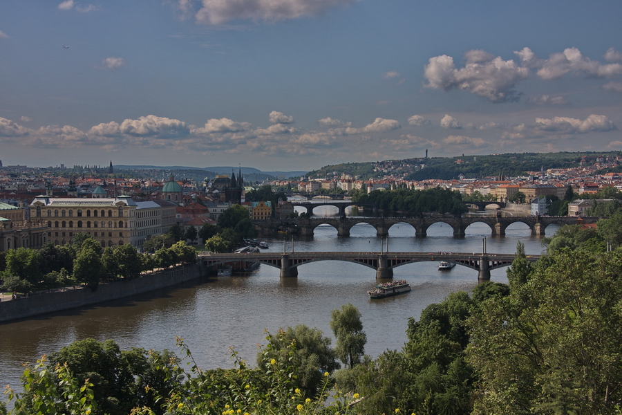 Am Fuße des Vysehrad befindet sich das U Ŝemika mit einem hübschen Innenhof, in dem wir uns mit etwas Flüssigkeit auf den Rückweg vorbereiten. Wie wir feststellen, war dies auch dringend notwendig. Der Rückweg in der Mittagssonne an der Moldau entlang zieht sich enorm in die Länge, die Sonne brennt und die Brückenunterführungen sind die wenigen schattigen Plätze zur kurzen Rast. Zwischen der Most Legii und der Karlsbrücke liegt direkt an der Moldau ein großer Biergarten, den wir um 14 Uhr erreichen. Hier unter den Schirmen und den Bäumen weht ein leichter Windhauch, der von der Moldau mitgebracht wird. Der Ausblick auf den Hradschin ist wunderschön und ein Singer / Songwriter überrascht mit wirklich angenehmer Live-Musik.